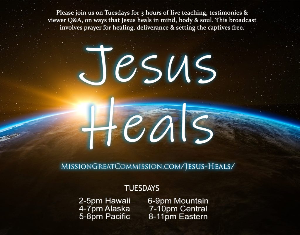 Please join us on Tuesdays for 3 hours of live teaching, testimonies & viewer Q&A, on ways that Jesus heals in heart, soul, mind & body. This broadcast involves prayer for healing, deliverance & setting the captives free.
